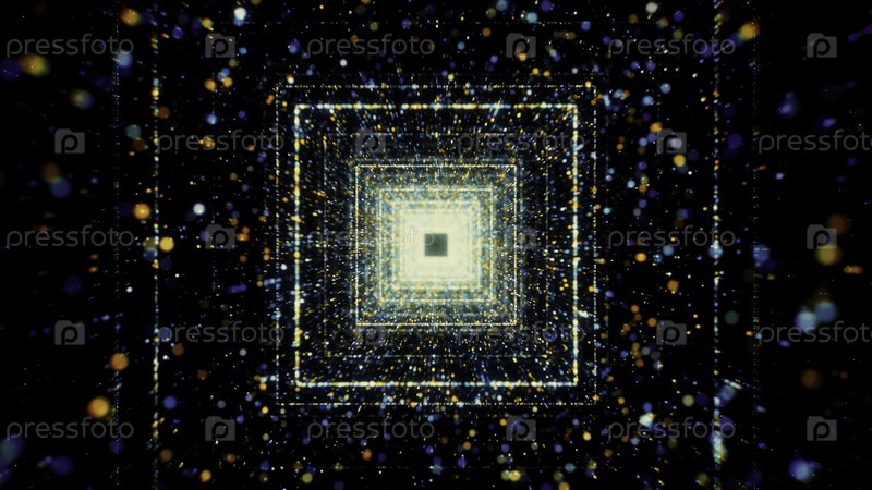 Синий фон в абстракции. Движение. Яркие синие квадраты выстроены по коридору и движутся вперед, рядом с ними сияют цветные частицы. Высокое качество 4k кадры