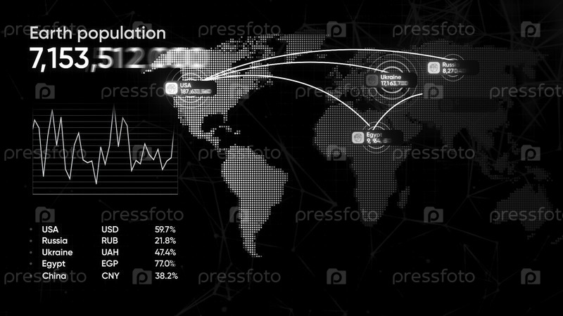 График населения Земли.Движение.Анимированная карта мира с движущимися линиями и графиками.3D-анимация аналитической карты мира с численностью населения