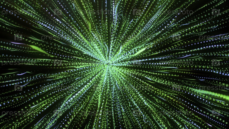 Абстрактный взрыв зеленой звезды в черном космическом пространстве.Движение.Прекрасная космическая картина распространения частиц, лучей и энергии