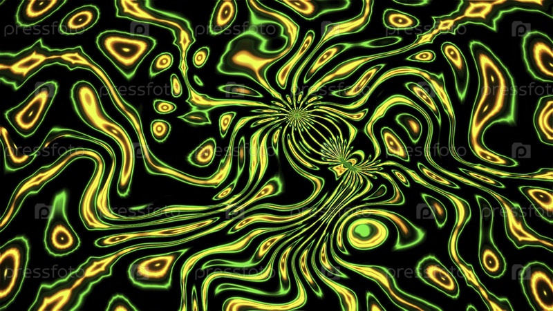 Психоделический рисунок с изогнутыми линиями и мигающими цветами. Движение. Изогнутые жидкие линии в психоделическом рисунке на черном фоне