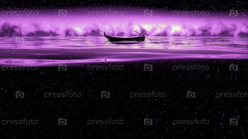 Яркий пейзаж. дизайн. фиолетовый и черный фон с видом на океан и маленькая черная лодка с веслами
