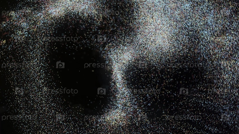Вихрь многоцветных частиц. анимация. водоворот многих цветных частиц движется, как будто в миксере. красочные моты пыли летают, как в миксере на черном фоне