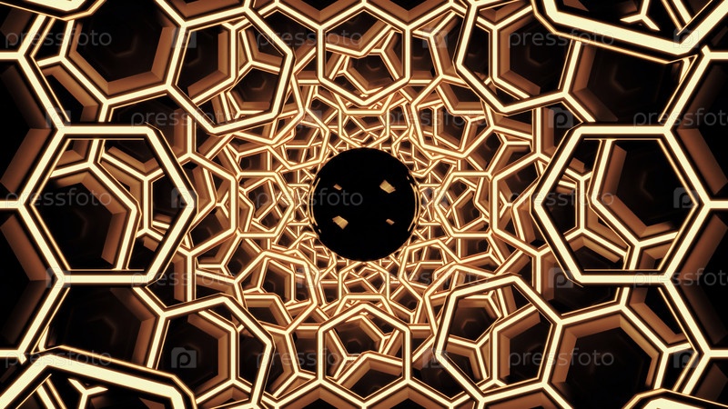 3D-туннель с шестиугольниками и движущейся черной дырой. Дизайн. Тоннель из трехмерных сосков с движущейся черной жидкостью в конце. Наполнение туннеля из сосок чёрной жидкостью