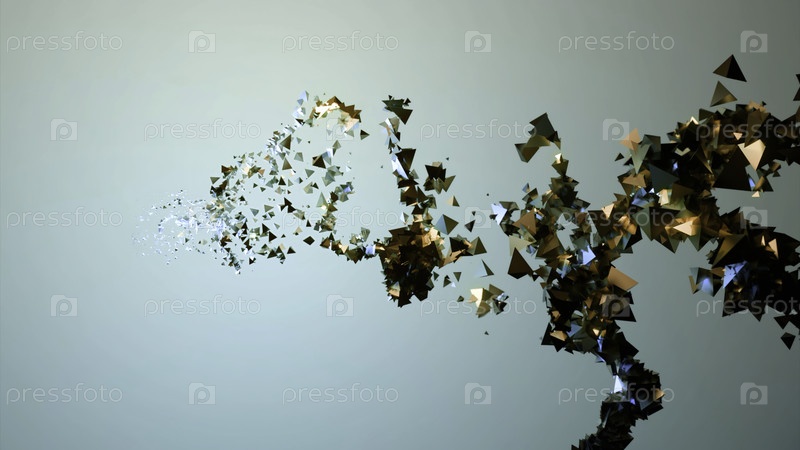 Абстрактный поток блестящих частиц на синем фоне. Дизайн. Зеркальные золотые летающие кусочки стекла, летящие и светящиеся