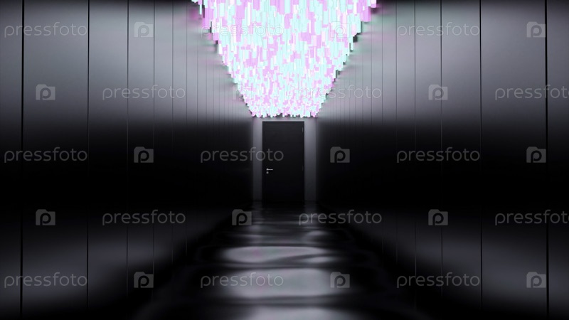 Вид на темный пугающий сюрреалистический коридор с дверью в конце. Дизайн. Монохромный коридор со светящимся цветным потолком внутри