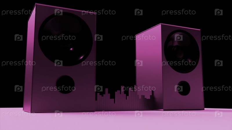 Фиолетовые и бирюзовые динамики. Дизайн. Огромные магнитофоны, играющие музыку с черными басами в анимации