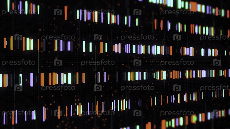 3D электронный фон с движущимися неонными полосами. Анимация. Неонные полосы перемещаются в ряды на черном цифровом фоне. Цифровое поле с двигающимися световыми сетевыми лентами
