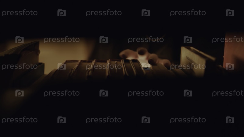 Пальцы, движущиеся по книжной полке. запись сделанная в большом количестве материалов. крупный план руки выбирает таинственную книгу на темной полке. мигающий свет на книжной полке со загадочной рукой
