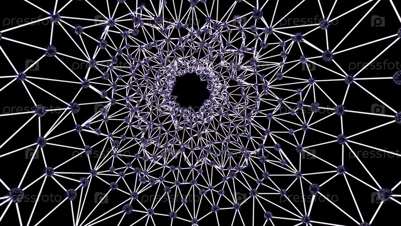 Абстрактная движущаяся текстура сплетения с туннельным эффектом на черном фоне. Дизайн. Соединенные линии и точки, как паутина