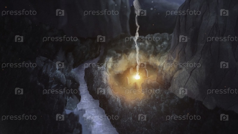 Абстрактная анимация старого волшебника, делающего зелье над кипящей кастрюлей с летающими странными ингредиентами и ярким лучом света, взлетающим вверх