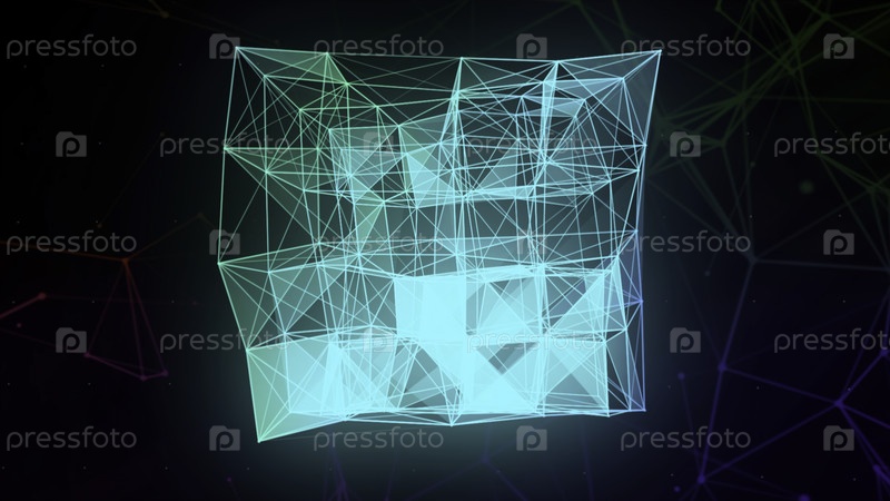 Искусственный интеллект создает голубую градиентную плоскость кубической 3D-фигуры.Движение.Светящий красивый трансформирующийся куба, научный фон