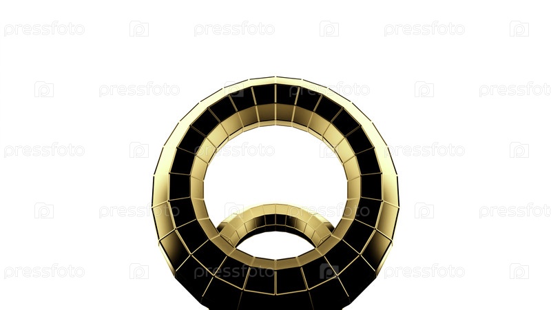 Текущие золотые металлические кольца одинакового размера на белом фоне. Дизайн. Технологический туннель круглой формы, бесшовная петля