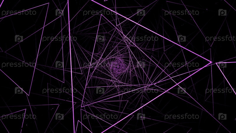 Фиолетовые большие треугольники с ярким освещением. Дизайн. Яркие линии и треугольники, создающие туннель на черном фоне в анимации. Высокое качество 4k кадры