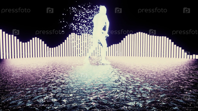 Абстрактный силуэт танцующего человека на фоне частиц света и эквалайзера.Дизайн.Концепция вечеринки и ночного клуба