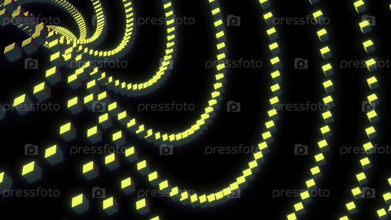 Движущийся поток линий из квадратов. Дизайн. Изогнутые линии квадратных перемещаются в пространстве. 3D-кубы движутся в изогнутом потолке линий на черном фоне