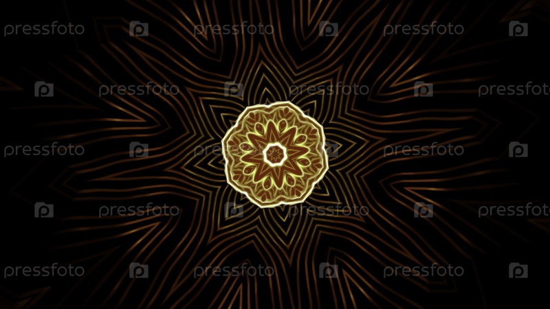 Неонный мандальный рисунок пульсирует на черном фоне. Дизайн. Красивый рисунок светящихся пульсирующих линий на черном фоне. Светящийся рисунок движется на черном фоне