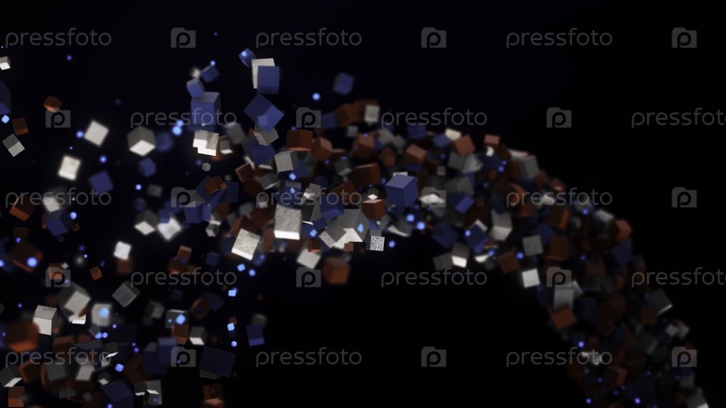 Кубические частицы образуют линию на черном фоне.Анимация.Кубы разных размеров соединены одной линией.Поток кубических частиц, переплетенный в линии
