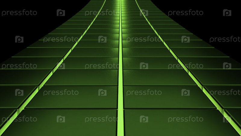 Гоночная дорога в киберпространстве. Дизайн. Движущаяся трасса с линиями в виртуальном пространстве на черном фоне. Изогнутая полоса с линиями для гонок в виртуальном пространстве