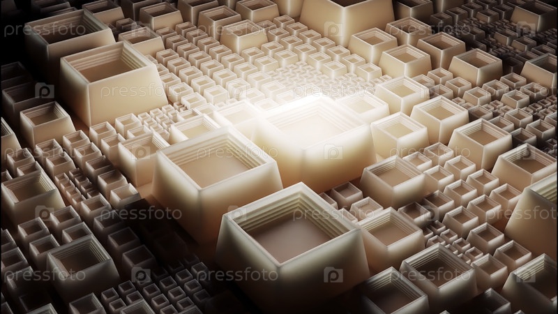 Мягкие розовые квадраты. Дизайн. 3D-квадраты разных размеров движутся вперед и на них светит яркий свет