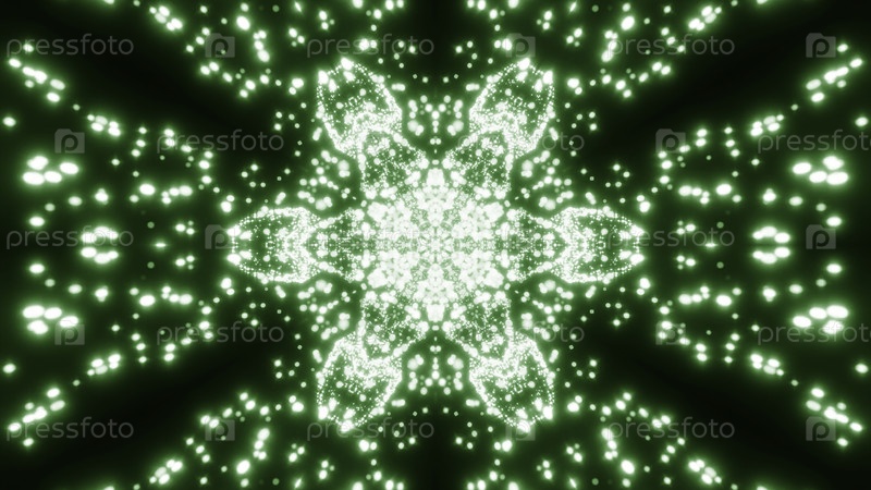 Цветовая калейдоскопическая форма, поглощающая крошечные светящиеся частицы. Дизайн. Пульсирующая симметричная фигура и летающие точки