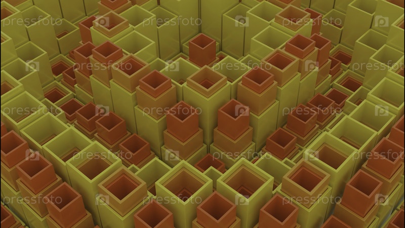 Желтые и зеленые восходящие геометрические формы. Дизайн. Маленькие 3D фигуры, которые по очереди поднимаются и падают в абстракции. Высокое качество 4k кадров