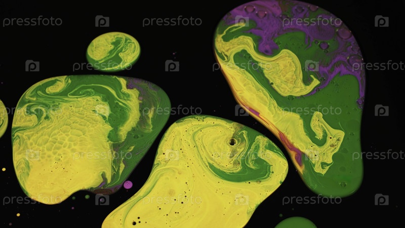 Текстура жидкой краски в замедленном движении, изолированная на черном фоне. Стоковые кадры. Художественный фон с смешиванием ярких цветов на черной поверхности, концепция флюидного искусства