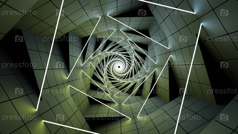 Сюрреалистический спиральный туннель с плитками.Дизайн.Твинтинговый тоннель со свистками и неоновыми полосами.Искаченная 3D-плита в спиральном туннеле