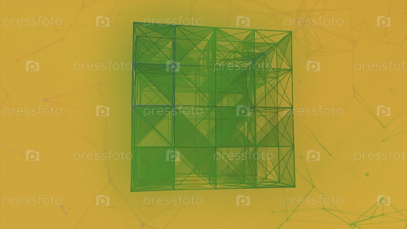 3D-куб из геометрических линий.Движение.Полигональный куб с линиями и треугольниками.Геометрический куб с линиями и формами в математическом пространстве