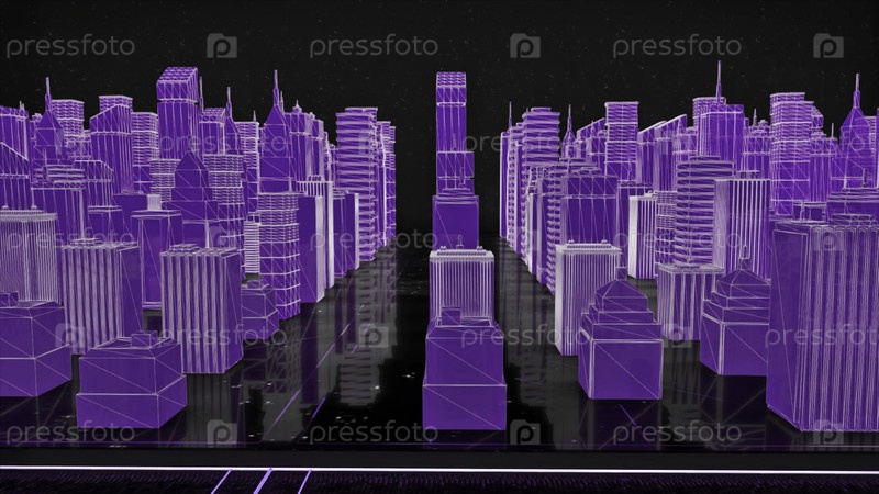 Абстрактные красочные конструкции цветного городского 3D-мокета.Анимация.Полет над небоскребами и зданиями цифрового города