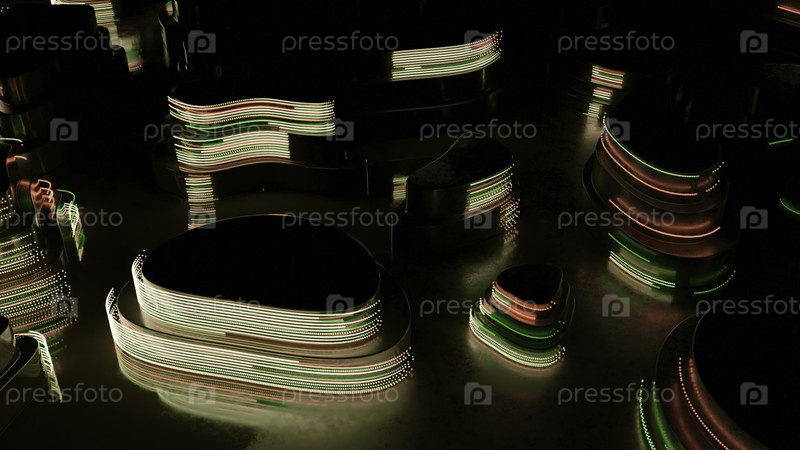 Овальные 3D-формы на поверхности. Дизайн. Темные 3D-формы на поверхности с неоновыми линиями. Формы с движущимися голографическими линиями на поверхности