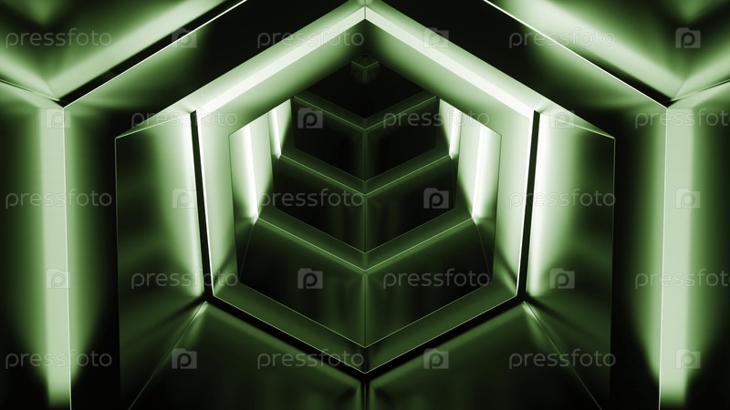 Выход из кибер-тунеля. Дизайн. Шестиугольный 3D тоннель с неоновыми линиями и металлической поверхностью. Обратное движение в кибер-туннеле