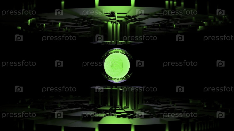 Светящийся шар в футуристической машине Дизайн вращающийся футуристический механизм с светящимся шаром в центре Механизм удерживает космический мяч в гравитационном поле