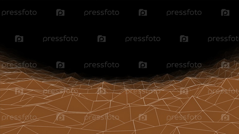 Летающий над ландшафтом решетки сплетения на темном фоне, бесшовная петля. Анимация. Футуристический фон с неравномерной яркой поверхностью