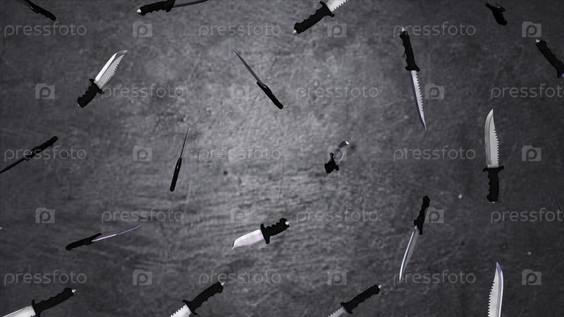 Большие ножи с острием вблизи изолированы на сером фоне.Анимация летающих ножей.Концепция большого количества оружия
