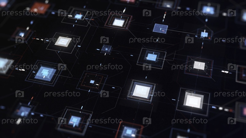 Высокотехнологичная компьютерная плата с большим количеством сигналов, быстро протекающих на черном фоне. абстрактный микросхема с красочными пульсирующими деталями квадратной формы
