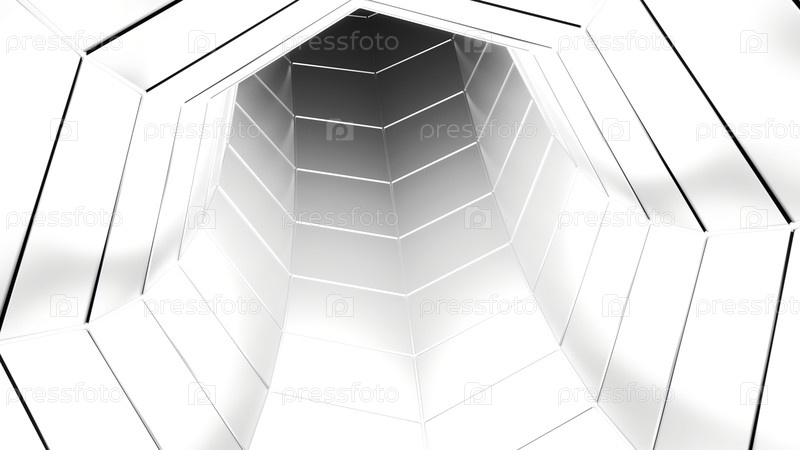 Головокружительное движение по футуристическому туннелю. Дизайн. Ослепительный белый тоннель с гладкой поверхностью в стиле футуризма. Головокружительный тоннель в киберпространстве