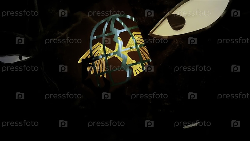 Визуализация мультфильма из сказки.Сцена.Золотая клетка с птицей, запертой внутри и множеством злых глаз