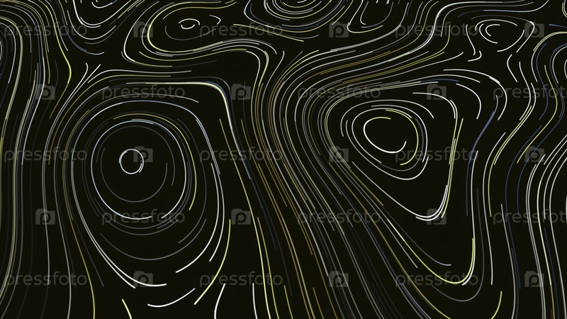 Топографическая карта неоновых линий. Движение. Медленно движущиеся цветные линии в потоке, создающие орнамент с изогнутыми овалами. Топографический ретро-орнамент с неонными линиями в потоке