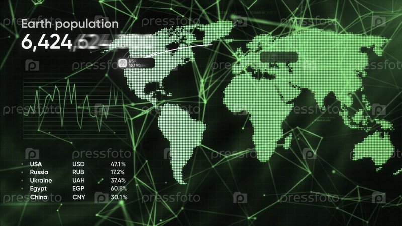 График населения Земли.Движение.Анимированная карта мира с движущимися линиями и графиками.3D-анимация аналитической карты мира с численностью населения