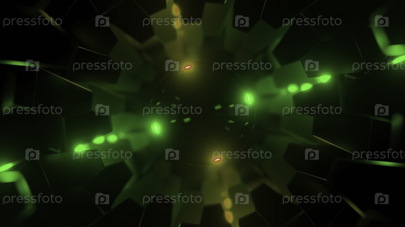 3D-анимация с вращающимися шестернями и шаром. Дизайн. Ротационный механизм с черным мячом в центре. Неоновый свет в вращающемся механизме с иллюзией мигающего черного шара в центре