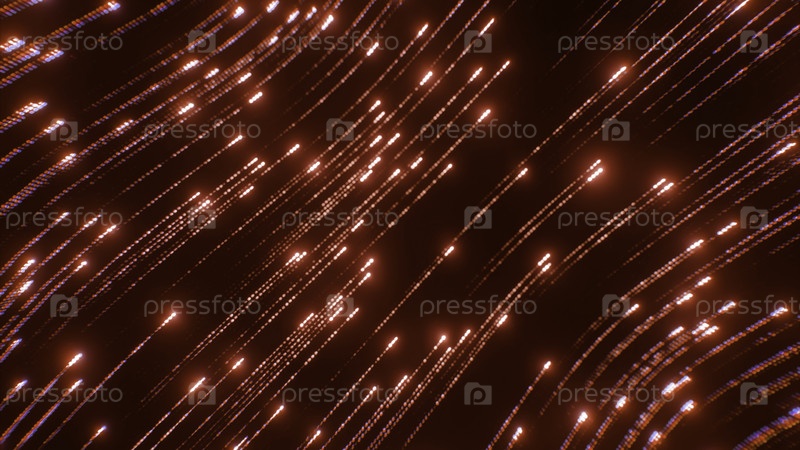 Летающие светящиеся частицы с хвостами. Дизайн. Яркие узкие изогнутые огни в небе