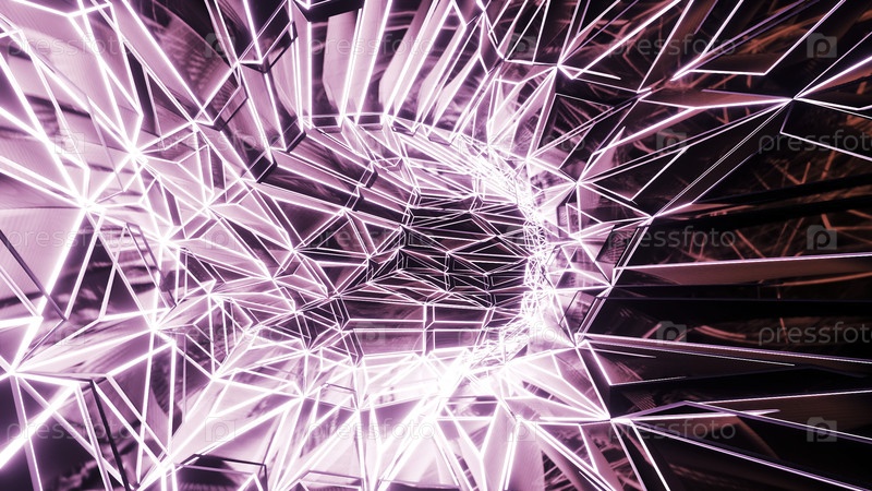 Дизайн. Движение через виртуальный кристаллический туннель. Яркий зеркальный тоннель в киберпространстве