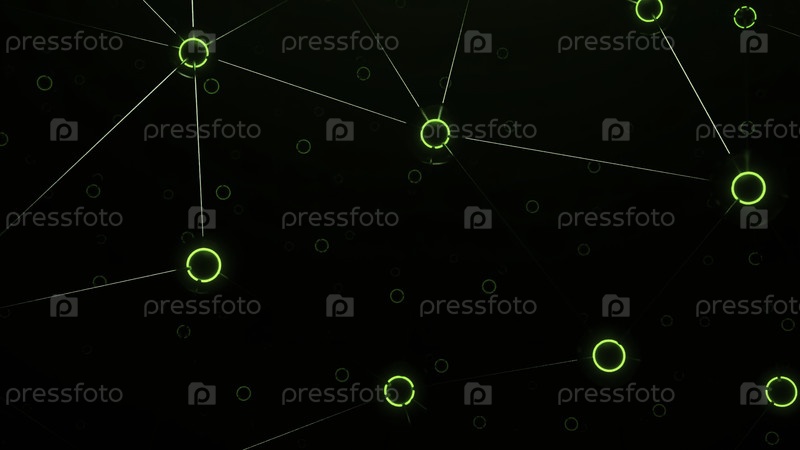 Зеленый и оранжевый темный фон.Дизайн.Соединенные выделяющие круги в абстракции, которые летают в разных направлениях