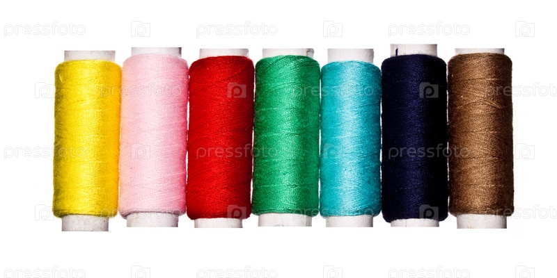 Разноцветные катушки с нитками, белый фон