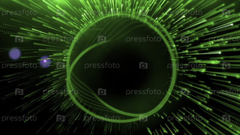 Зеленый фон. Движение. Яркое многоцветное лазерное кольцо в анимации, рядом с которым летает салют. Высококачественные 4k кадры