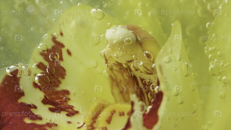 Красивый желтый цветок с потоком пузырей. Скриншоты. Цветок в бушующей воде. Близкий план потоков пузырьков в воде с цветком