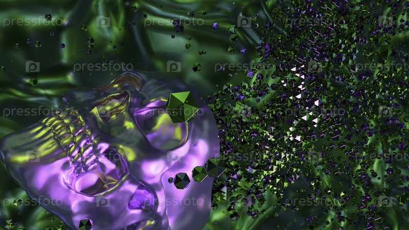 Стильная анимация с 3D-черепом. Дизайн. Красочная 3D-анимация с черепом и взрывным потоком частиц. Поток 3D-частиц, когда паразиты выходят из черепа. Поток мыслей с черепом в красочной абстрактной анимации