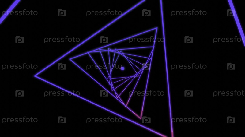 Цветные треугольники спирально на черном фоне. Дизайн. Поворачивающиеся треугольники в спирали. Простая геометрическая спирала треугольников
