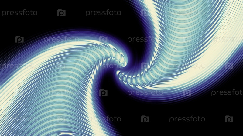 Синие изгибающие лучи света, отходящие на черном фоне. Движение. Яркие светящиеся голубые спиральные формы