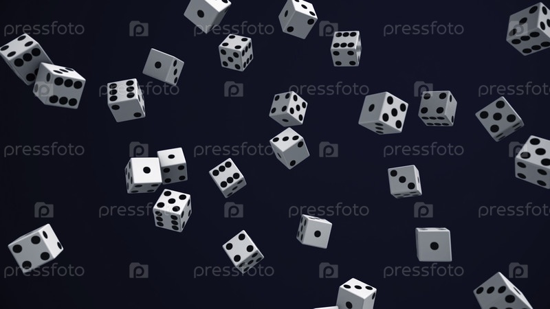 Много костей. Анимация. Множество движущихся и вращающихся кубиков в невесомости на закрытом фоне. Концепция азартных игр. Вероятность получения правильной комбинации костей
